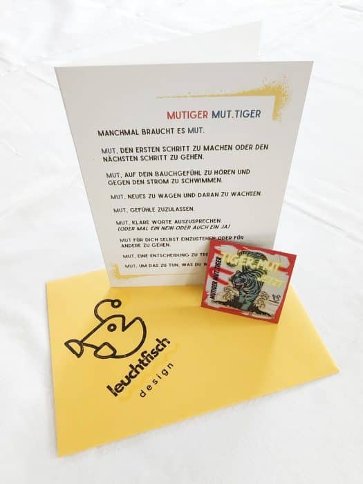In der MUT.TIGER Karte findest du neben einem inspirierenden Text auch einen Magneten den du gut sichtbar befestigen kannst um dir jederzeit Mut holen zu können.