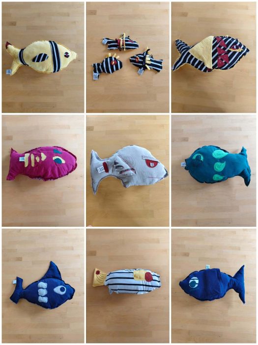 Aus alten, ausgedienten, beschädigten T-Shirts zaubert Frau Leuchtfisch dekorative Polster in Form von fantasievollen Fischen. Kreatives Upcycling zum Kuscheln.